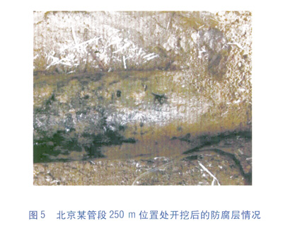 為了進一步對檢測結果的準確性進行判斷和分析,這里采用了開挖驗證的方式。在4Hz電流信號測量結果中(見圖3),在距離起點約250m處附近出現了防腐層的面電阻率較低的現象,而l28Hz電流信號檢測的結果表明該處防腐層的質量相對較好(見圖4)。結合ACVG對防腐層質量較差的位置進行定位和開挖驗證,該處開挖坑內防腐層的情況見圖5。
