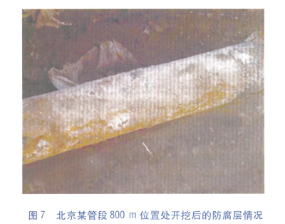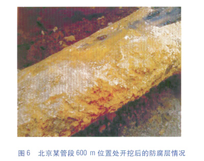在128Hz電流測量信號的結果中(見圖4),在600m和800m左右的位置上,出現了防腐層質量較差的情況,對兩處位置進行定位和開挖,開挖坑內防腐層的情況分別見圖6、7。