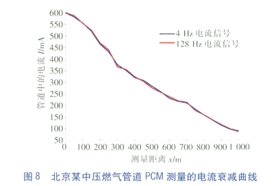 從圖8可以看出,在野外環境中,受到干擾較小,4Hz和128Hz的電流衰減曲線基本一致,沒有出現較大波動的情況。利用評估軟件對燃氣管道的防腐層面電阻率進行計算,4Hz電流信號的防腐層平均面電阻率的計算結果為8264W·m2;128Hz電流信號的防腐層面電阻率的計算結果為8697W·m2。對照組的實驗結果表明,在干擾較小的情況下,4Hz電流信號和128Hz電流信號的檢測結果差異不大。