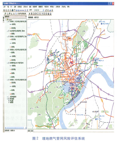 杭州市燃?xì)饧瘓F(tuán)有限公司(以下簡(jiǎn)稱杭燃公司)依托杭州燃?xì)夤芫W(wǎng)信息系統(tǒng),開(kāi)發(fā)了埋地燃?xì)夤芫W(wǎng)風(fēng)險(xiǎn)評(píng)估系統(tǒng)(見(jiàn)圖2)。該系統(tǒng)以目前管道行業(yè)成熟的“穆氏評(píng)估原理”為原型,結(jié)合杭州燃?xì)夤芫W(wǎng)實(shí)際情況和相關(guān)標(biāo)準(zhǔn),從實(shí)用、簡(jiǎn)潔、靈活、高效出發(fā),借助GIS技術(shù)空間化、圖形化的特點(diǎn),提供一個(gè)安全叮靠、操作簡(jiǎn)便的埋地燃?xì)夤艿里L(fēng)險(xiǎn)評(píng)估平臺(tái)。它還成功地將風(fēng)險(xiǎn)評(píng)估與管網(wǎng)GIS高度集成,實(shí)現(xiàn)GIS管道屬性數(shù)據(jù)和風(fēng)險(xiǎn)分析數(shù)據(jù)相互調(diào)用,其內(nèi)容包含參數(shù)設(shè)置、評(píng)估指標(biāo)管理、街道及調(diào)查段信息管理、工程管理、風(fēng)險(xiǎn)數(shù)據(jù)、評(píng)估管理、風(fēng)險(xiǎn)檢索和風(fēng)險(xiǎn)顯示預(yù)警及減緩措施、分析與報(bào)表等功能。該系統(tǒng)不僅收錄了新舊管網(wǎng)的防腐層數(shù)據(jù),還包括管網(wǎng)所在的土壤腐蝕性、雜散電流、周?chē)h(huán)境情況及搶修數(shù)據(jù)等,能最大限度地準(zhǔn)確評(píng)估埋地燃?xì)夤芫W(wǎng)的安全狀況,預(yù)防事故的發(fā)生,及早識(shí)別危險(xiǎn)源,為用戶提供了更為直接的追蹤危險(xiǎn)管段的重要依據(jù)。
