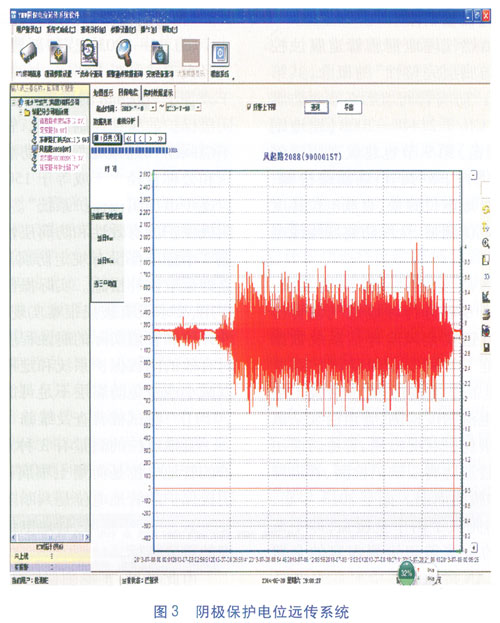 CJJ 95—2003規(guī)定“處于干擾腐蝕地區(qū)的管道,應(yīng)采取防干擾的排流保護(hù)措施”。2013年伴隨著杭州市地鐵的到來(lái),為研究杭州地鐵雜散電流對(duì)埋地燃?xì)怃摴艿挠绊懀既脊疽肓薙CM雜散電流檢測(cè)系統(tǒng),對(duì)地鐵開(kāi)通前后沿線埋地燃?xì)怃摴苌系碾s散電流進(jìn)行了檢測(cè),并出具了檢測(cè)報(bào)告,以便將來(lái)制定相應(yīng)的排流措施。此外杭燃公司還在地鐵沿線有代表性的站點(diǎn)附近安裝陰極保護(hù)電位遠(yuǎn)傳系統(tǒng)(見(jiàn)圖3),實(shí)現(xiàn)全天候24h自動(dòng)測(cè)量埋地燃?xì)夤芫W(wǎng)管地電位。