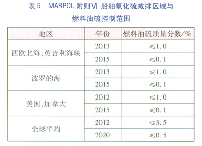 《國際防止船舶造成污染公約(MARPOL)》在附則Ⅵ中對船舶氧化硫減排區域與燃料油硫控制作出了明確規定(見表5)。如果我國在船舶污染減排上沒有諸如此類嚴格的環保措施,將難以推動以LNG替代高污染的船用燃料油,也就對環境改善難以發揮作用,更不用說達到減排目標了。