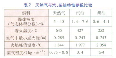 LNG屬低溫液體,發生泄漏事故時會很快自然氣化成天然氣,沒有殘留物。天然氣密度比空氣小,很快在空氣中揮發擴散。天然氣著火溫度和空氣中最小點火能均高于汽、柴油和LPG,瞬間著火也比油品類慢。從使用安全性上考慮,LNG比汽油、柴油安全。天然氣與汽、柴油特性參數比較見表2。