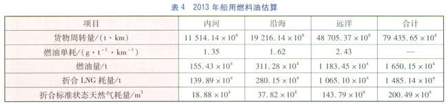 根據交通運輸部((2013年交通運輸行業發展統計公報》,截至2013年底,我國現有內河運輸船舶15.91×104艘、沿海運輸船舶11024艘、遠洋運輸船舶2457艘。2013年,全國完成水路貨運量55.98×108t、貨物周轉量79435.65×108t·km,平均運距1419.04km;在全國水路貨運中,內河貨物周轉量11514.14×108t·km,沿海運輸完成貨物周轉量19216.14×108t·km,遠洋運輸貨物周轉量48705.37×108t·km。能耗方面,2013年全年內河、沿海和遠洋貨運企業燃料油耗量為1650.15×104t,按燃料油低熱值為44MJ/kf、天然氣低熱值為36MJ/m3進行等熱量折算,則折合標準狀態天然氣200.49×108m3,預計2015年船用燃料油折算標準狀態天然氣約為230×108m3。2013年船用燃料油估算見表4。