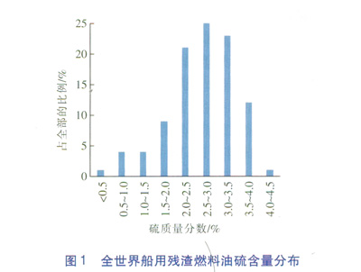 根據國際海事組織(IMO)的規定,從2012年1月1日起,在世界范圍內,船用燃料油硫含量(質量分數)上限從4.5%降低到3.5%,目前硫含量(質量分數)平均值為2.7%~2.8%,我國相關標準GB/T 17411—2012《船用燃料油》也根據上述規定進行了調整。國際海事組織對全球船用殘渣燃料油的統計分析也表明:在過去一段時間內,硫質量分數在2.5%~3.0%區間內的船用殘渣燃料油占全部船用殘渣燃料油的比例為25%,大部分船用殘渣燃料油的硫質量分數處于2.0%~3.5%范圍(見圖1),硫含量遠高于車用燃料中的硫含量。