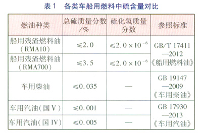 在船用燃料使用方面,除運河、湖泊內運行的小型船舶使用柴油外,遠洋、近海以及長江等內河運輸船舶基本使用船用燃料油。根據中商情報網2011年發布的《2011—2015年中國燃料油行業調研分析及市場預測報告》,預計到2015年,我國船用燃料油的需求量將由2010年的1396×104t/a增長到1867×104t/a。根據國家有關車船用燃料相關標準,船用燃料油中硫化物等的允許含量遠超過車用燃料油允許含量的上限,其中船用殘渣燃料油的總硫含量達到車用汽油(國IV)的400~700倍,是車用柴油的57~100倍,具體比較見表l。