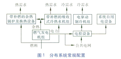 分布系統(tǒng)一般包括動(dòng)力設(shè)備(主要為發(fā)電機(jī)組)、余熱利用設(shè)備(主要為帶補(bǔ)燃的余熱鍋爐、換熱設(shè)備、帶補(bǔ)燃的吸收式冷熱水機(jī)組等)、供配電設(shè)備(主要為電控設(shè)備等)、燃?xì)夤?yīng)設(shè)備、監(jiān)控裝置等,常規(guī)配置見圖1。在實(shí)際設(shè)計(jì)中,應(yīng)根據(jù)發(fā)電機(jī)組特性、用戶需求(熱電比、冷熱負(fù)荷特性)等多方面因素合理配置分布系統(tǒng),以實(shí)現(xiàn)能源的高效經(jīng)濟(jì)利用。