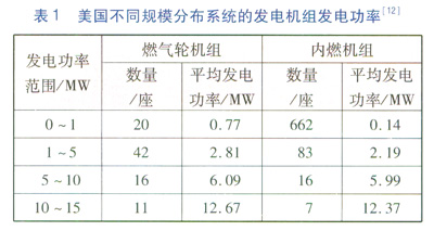 內(nèi)燃機(jī)組是將液體或氣體燃料與空氣混合后,直接輸入氣缸內(nèi)部燃燒并產(chǎn)生動(dòng)力的設(shè)備,是一種將熱能轉(zhuǎn)化為機(jī)械能的熱機(jī),具有體積小、熱效率高、啟動(dòng)性能好等優(yōu)點(diǎn),發(fā)電功率范圍為5~18000kW。美國(guó)不同規(guī)模分布系統(tǒng)的發(fā)電機(jī)組發(fā)電功率見表1[12]。