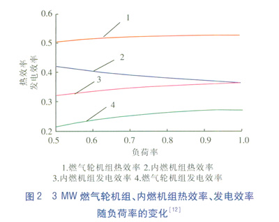 在分布系統(tǒng)中,發(fā)電機(jī)組常運(yùn)行在部分負(fù)荷狀態(tài)下,其變工況特性對(duì)分布系統(tǒng)綜合性能影響較大。以發(fā)電功率均為3MW的燃?xì)廨啓C(jī)組、內(nèi)燃機(jī)組為例,熱效率、發(fā)電效率隨負(fù)荷率的變化見圖2[12]。由圖2可知,隨著負(fù)荷率的降低,兩種發(fā)電機(jī)組的發(fā)電效率均呈現(xiàn)下降趨勢(shì),但內(nèi)燃機(jī)組的發(fā)電效率比燃?xì)廨啓C(jī)組高10%(絕對(duì)值)左右。燃?xì)廨啓C(jī)組的熱效率明顯高于內(nèi)燃機(jī)組,前者的熱效率隨著負(fù)荷率的降低而降低,后者的熱效率隨著負(fù)荷率的降低有上升趨勢(shì)。由以上分析可知,盡管兩種發(fā)電機(jī)組在額定工況下具有大致相同的熱電總效率(熱效率與發(fā)電效率之和),但內(nèi)燃機(jī)組的變工況特性更優(yōu)。