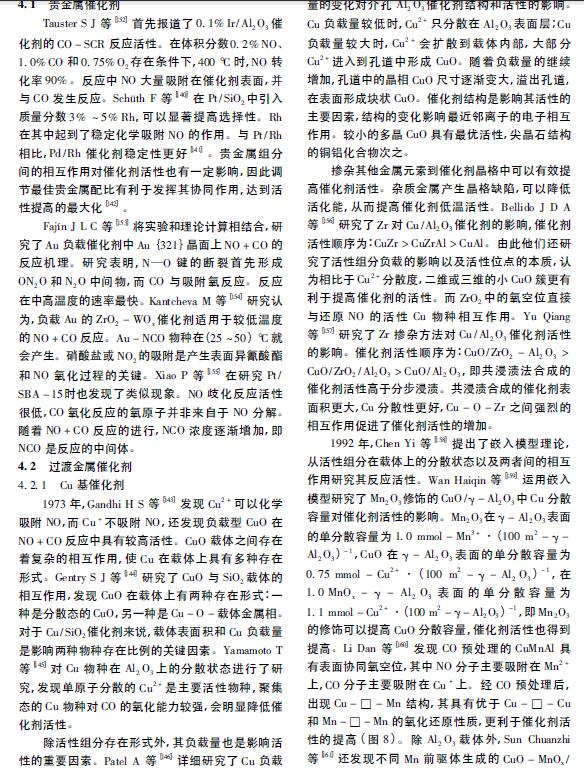 Niu Can 等合成的Cu3. 44 - SAPO - 34 催化劑800 ℃老化16 h,( 225 ~ 400) ℃時NO 轉化率依然大于90%主要原因是水熱老化過程增加了孤立態Cu2 + 活性位點,降低了活化能。Hu Xiaoqing 等研究進一步表明,顆粒尺寸不同Cu /SAPO - 34 催化劑的表觀活化能不變,孔隙擴散不影響催化劑活性,活性Cu2 + 的動力學特性是影響反應速率的主要原因。除Cu 分子篩催化劑外,Fe 分子篩催化劑由于在高溫下( > 400 ℃) 的穩定性和活性更好,顯示出良好的應用前景。Rid Q Long 等 制備了Fe - ZSM - 5 催化劑,( 375 ~ 600) ℃時NO 轉化率接近100%,高出工業用V 基催化劑活性約16 倍。