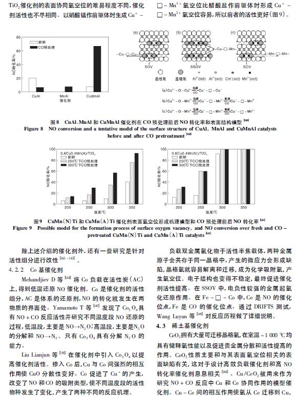 在CeTi 催化劑中,Ce 和Ti 在原子級別上的相互作用產生的Ce - O - Ti 有助于提高催化劑活性。Li Ping 等[75]用FETEM 直接觀察到Ce - O - Ti 結構,無定型Ce0. 3 TiO∞在( 175 ~ 400) ℃ 時的NO 轉化率為90%。此外,利用XANES 和原位FTIR 等證明了表面高度分散的Ce - O - Ti 結構是反應的活性中心。Chen Lei 等 利用溶膠- 凝膠法合成CuCeTi 催化劑,在( 150 ~ 250) ℃時的NO 轉化率大于80%,Cu 提供的L 酸位點成為反應的活性中心,加速了低溫段快速SCR 反應過程。Li Lulu 等在此基礎上進行改進( 圖5) ,在Ce - Ti 催化劑中摻雜了少量Cu2 + ,可以顯著提高催化劑的低溫SCR 活性。研究表明,Cu 與Ce 物質的量比0. 005 時,( 200 ~400) ℃的NO 轉化率為80%,N2選擇性為100%。Cu - O - Ce 的形成促進了Ce4 + 向Ce3 + 的轉化,增加了表面活性氧。分散態Cu 增加了Ce -Ti 催化劑表面酸性,提高了NH3吸附能力,從而加速了反應向E - R 機理方向進行。在Ce - Ti 催化劑中摻雜W 可以在Ce - W 間產生強烈的相互作用,產生更多的Ce3 +、NOx 和NH3吸附物種,從而提高催化劑活性。Fu Mengfan 等發現,采用共浸漬法時,在( 200 ~ 400) ℃ 的NO 轉化率大于90%。Shan Wenpo 等[84]利用均相沉淀法進一步提高了Ce -W - Ti 催化劑在高空速下的活性,在Ce 與W 物質的量比1∶ 1、空速500 000 h - 1和溫度( 275 ~ 400) ℃條件下,NO 轉化率為90%。W 的引入促進了活性Ce 的分散,增加了催化劑表面活性CeO2晶體、氧空位和酸位。在低溫段( < 300 ℃) ,W 促進了NO 向NO2的氧化,在高溫段( > 300 ℃) ,W 提高了N2選擇性。