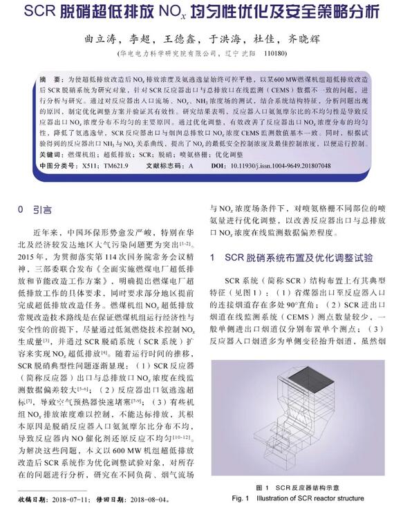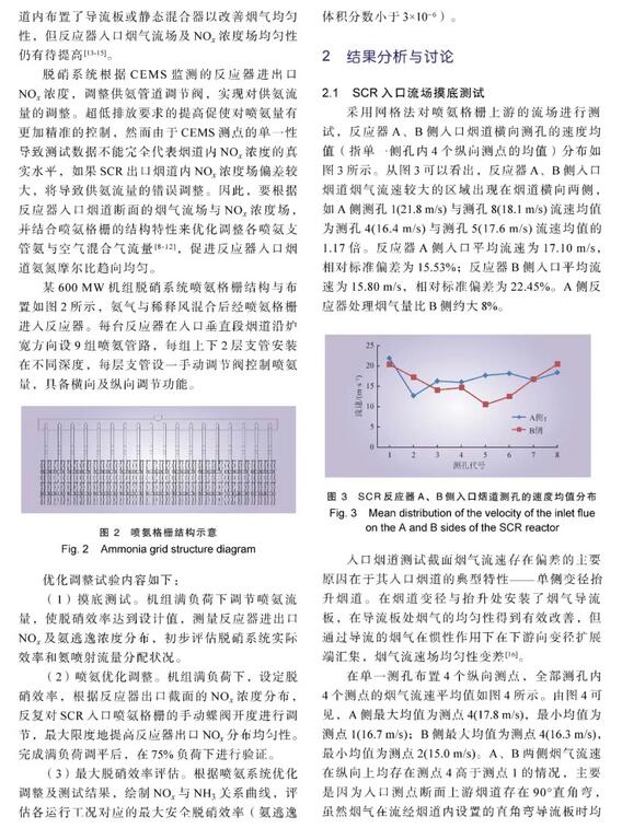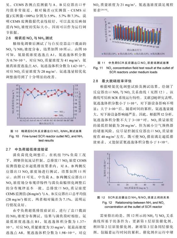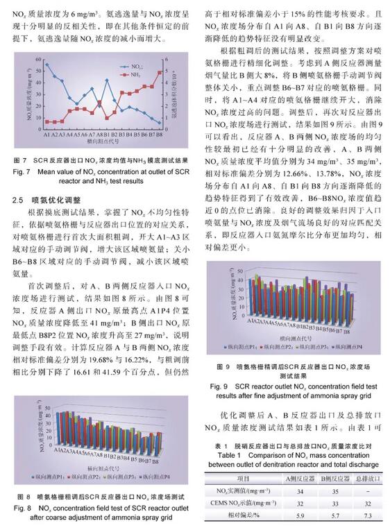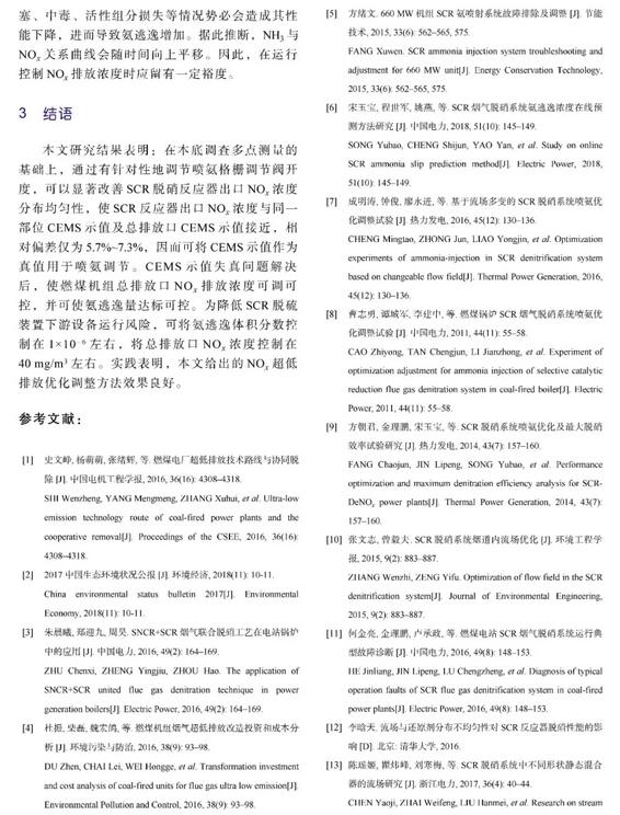 結論:本文研究結果表明:在本底調查多點測量的基礎上,通過有針對性地調節噴氨格柵調節閥開度,可以顯著改善SCR脫硝反應器出口NOx濃度分布均勻性,使SCR反應器出口NOx濃度與同一部位CEMS示值及總排放口CEMS示值接近,相對偏差僅為5.7%~7.3%,因而可將CEMS示值作為真值用于噴氨調節。CEMS示值失真問題解決后,使燃煤機組總排放口NOx排放濃度可調可控,并可使氨逃逸量達標可控。為降低SCR脫硫裝置下游設備運行風險,可將氨逃逸體積分數控制在1×10–6左右,將總排放口NOx濃度控制在40 mg/m3左右。實踐表明,本文給出的NOx超低排放優化調整方法效果良好。