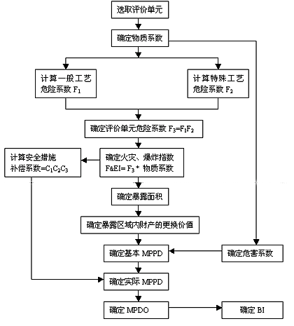 Index)進(jìn)行分析研究。道化學(xué)公司火災(zāi)及爆炸指數(shù)評價法是對化工工藝過程和生產(chǎn)裝置的火災(zāi)、爆炸危險性進(jìn)行評價并采取相應(yīng)安全措施的一種方法,該方法主要用于評價儲存、處理、生產(chǎn)易燃、可燃、活性物質(zhì)的操作過程,也可用于潛在危險物質(zhì)庫存量較少的工藝過程的風(fēng)險評價,但適用的易燃或活性化學(xué)物質(zhì)的最小處理量為454kg左右,如果單元內(nèi)物質(zhì)數(shù)量低于上述數(shù)值,則評價的結(jié)果可能夸大其危險性。該方法的要點(diǎn)[3]如下: