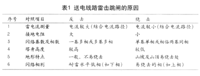 清楚了送電線路雷擊跳閘的發生原因,對照下面表1內容,我們就可以有針對性的對設計中送電線路經過的不同地段,不同地理位置的桿塔采取相應的防雷措施。