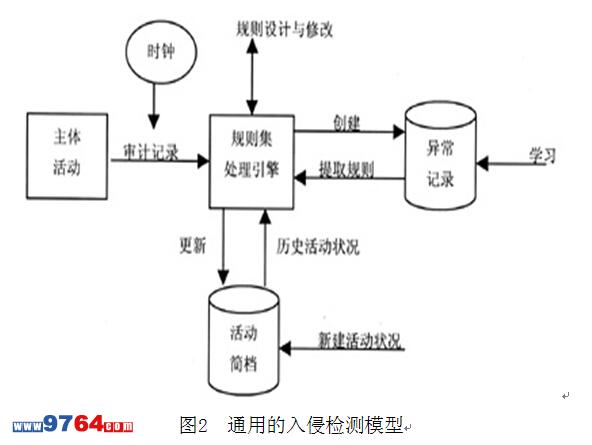 入侵檢測(Intrusion Detection)是對入侵行為的發覺,是防火墻的合理補充,幫助系統對付網絡攻擊,擴展了系統管理員的安全管理能力(包括安全審計、監視、進攻識別和響應),提高了信息安全基礎結構的完整性。它從計算機網絡系統中的若干關鍵點收集信息,并分析這些信息,看看網絡中是否有違反安全策略的行為和遭到襲擊的跡象。入侵檢測被認為是防火墻之后的第二道安全閘門,在不影響網絡性能的情況下能對網絡進行監測,從而提供對內部攻擊、外部攻擊和誤操作的實施保護。Dennying于1987年提出了一個通用的入侵檢測模型(如圖2所示)。