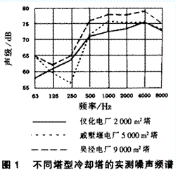 在距進風口底緣即一般倒t形塔基的水池邊沿5m 處,測高點 1.2 m[1],測得的一些自然通風冷卻塔的實測噪聲及其頻譜見圖1。