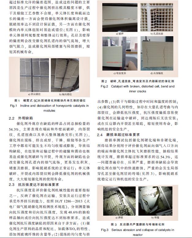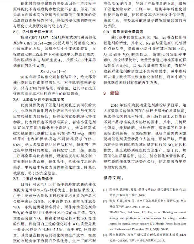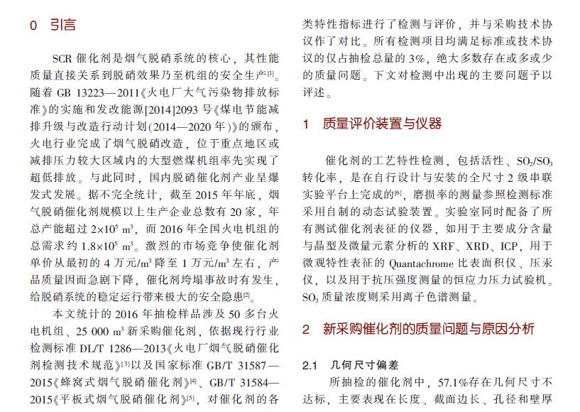 摘要: 為規范脫硝催化劑的質量監督與管理,國內各大發電集團先后要求對新采購催化劑進行強制抽檢。對2016年的抽檢樣品檢測結果進行統計,相當多的新采購催化劑存在這樣或那樣的質量問題,其中幾何尺寸偏差與外觀缺陷達不到標準的各占57.1%和54.3%,抗壓強度與磨損率等物理性能達不到標準的各占48.6%和54.3%,有8.6%的催化劑活性和比表面積低于標準限值,主要成分WO3含量偏低或微量元素高于技術協議的各占62.9%和5.7%。檢測結果表明,目前國內SCR脫硝催化劑的供貨質量不容樂觀,急需規范與管理。