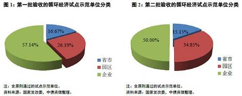 我國亦重視推動國內循環經濟的發展。為減少資源消耗、降低廢物排放和提高資源生產率,最終實現經濟增長方式的根本性轉變,2005年以來,國家發改委等部委開展了兩批國家循環經濟試點示范工作。經過試點前期的探索與實踐,第一批84家、第二批66家國家循環經濟試點示范單位分別于2014年11月、2015年5月通過驗收。考慮到按照循環經濟的尺度,可將其實踐劃分為宏觀的合作消費、零廢棄物社會,中觀的生態產業園,以及微觀的清潔生產機制,分別對應省市、園區及企業3個級別,中債資信擬據此將通過驗收的試點單位進行分類,具體如下圖所示。