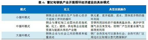 鋼鐵行業具有鋼鐵生產、能源轉換、廢棄物回收利用三大功能,該行業循環經濟發展模式也是圍繞這三大功能而展開,具體通過大、中、小三個循環來實現。以曹妃甸為例,曹妃甸是我國重要的鋼鐵產業基地,隨著首鋼整體搬遷至曹妃甸,曹妃甸一躍而成我國北方最大的鋼鐵生產中心,而循環經濟思想貫穿其發展的各方面,其循環經濟應用的具體模式如下表所示。