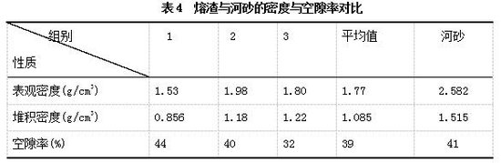檢測了三組熔渣的表觀密度和堆積密度,并且計算了各組熔渣的空隙率,結果列于表4。