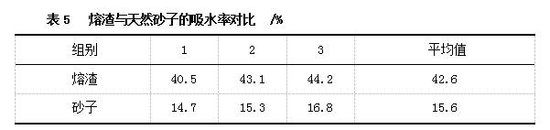 材料的吸水率可以反映材料內部的孔隙結構、孔隙的大小與數量,它直接影響其制備建筑材料時的需水量。為了便于比較,同時測試了熔渣和天然砂子的吸水率,結果如表5所示。比較二者的吸水率可以發現,熔渣的吸水率平均值為42.6%,相較于天然河砂的15.6%,熔渣的吸水性大,如果充當細骨料則會明顯增加混凝土用水量,從而直接影響混凝土的和易性和強度。從吸水率結果判斷,熔渣不宜單獨作為細骨料使用。