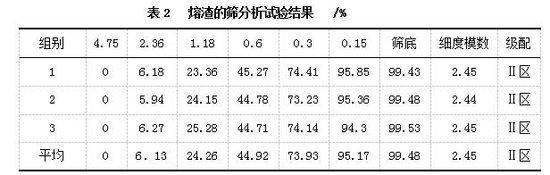 3組熔渣的篩分試驗結果列于表2(累計篩余(%)、細度模數和級配)。