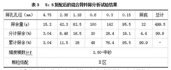 由表2可知,熔渣的細度模數為2.45,在中砂范圍;級配曲線在規定的三個級配區Ⅱ區,粒徑在0.3和0.15之間比較多,整體偏細。試驗結果說明熔渣不宜單獨使用,要想滿足混凝土骨料要求,可以考慮將熔渣與天然河砂復合配制使用。為此,將熔渣樣品1:天然砂子(細度模數2.45)按照5:5進行了混合復配,復配后的混合骨料篩分析結果如表3所示。