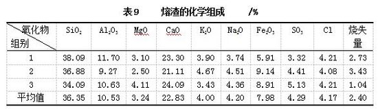 根據元素組成進而推算出各元素的化學存在形式,即化合物組成。經過計算,熔渣中的上述元素主要以氧化物形式存在,占比重較大的依次為SiO2、CaO、Al2O3、Fe2O3,另外含有少量的K2O、Na2O、MgO、SO3及Cl。熔渣的化學組成分析結果詳見表9。