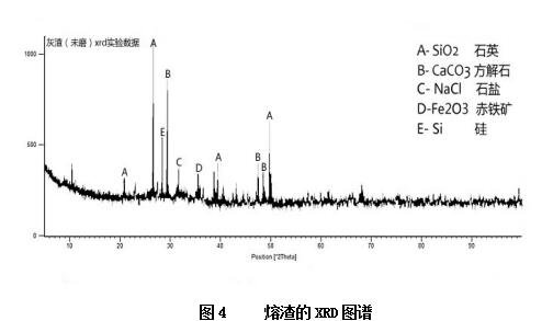 可以看出,熔渣中有較強衍射峰的物質有石英(α-SiO2)、方解石(CaCO3)、石鹽(NaCl)、赤鐵礦(Fe2O3)及單質硅(Si)等晶體礦物成分。XRD圖譜中并未出現像粉煤灰那樣比較寬大的衍射特征峰,說明熔渣的結構致密,玻璃化程度偏低,而玻璃化程度決定了材料的活性程度,即活性SiO2含量低。分析結果進一步證實熔渣的化學穩定性高,活性很低或者說基本不具備火山灰活性,說明熔渣并不適合作為水泥的替代材料,比較適合于作為替代骨料使用。