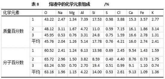 采用電子探針精確測試了熔渣的化學元素組成,結果列于表8。