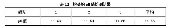 水泥混凝土是一種偏堿性的材料,正因為如此,才能對包裹其中的鋼筋起到很好的保護作用。為了確定熔渣是否適合在混凝土中使用,檢測了3組熔渣樣品的pH值,結果列于表12。