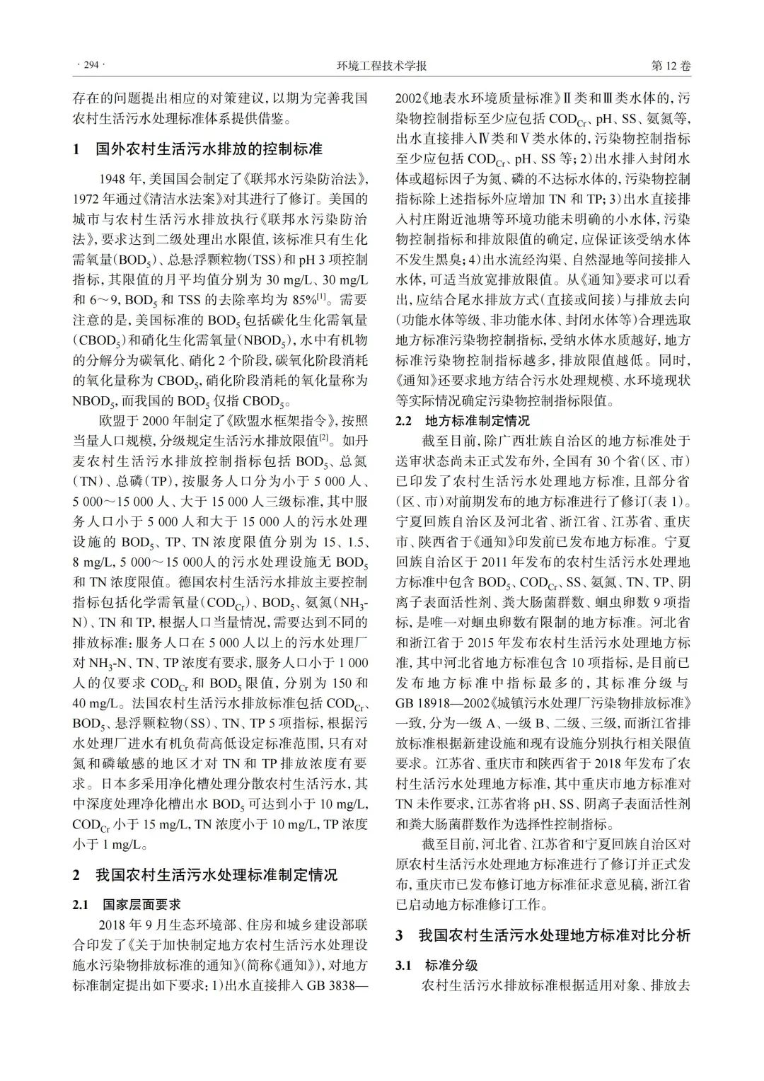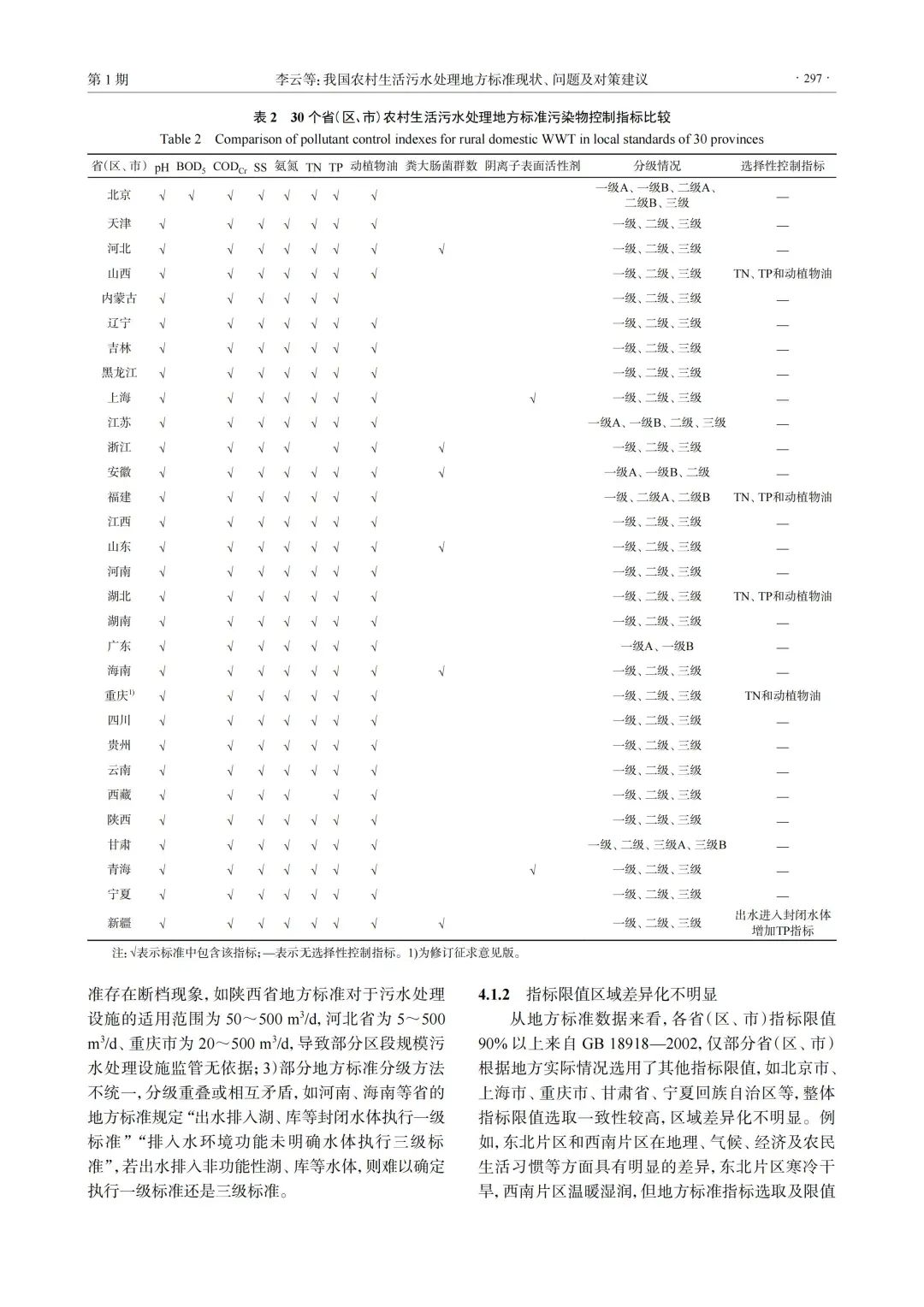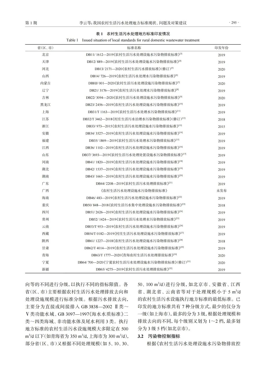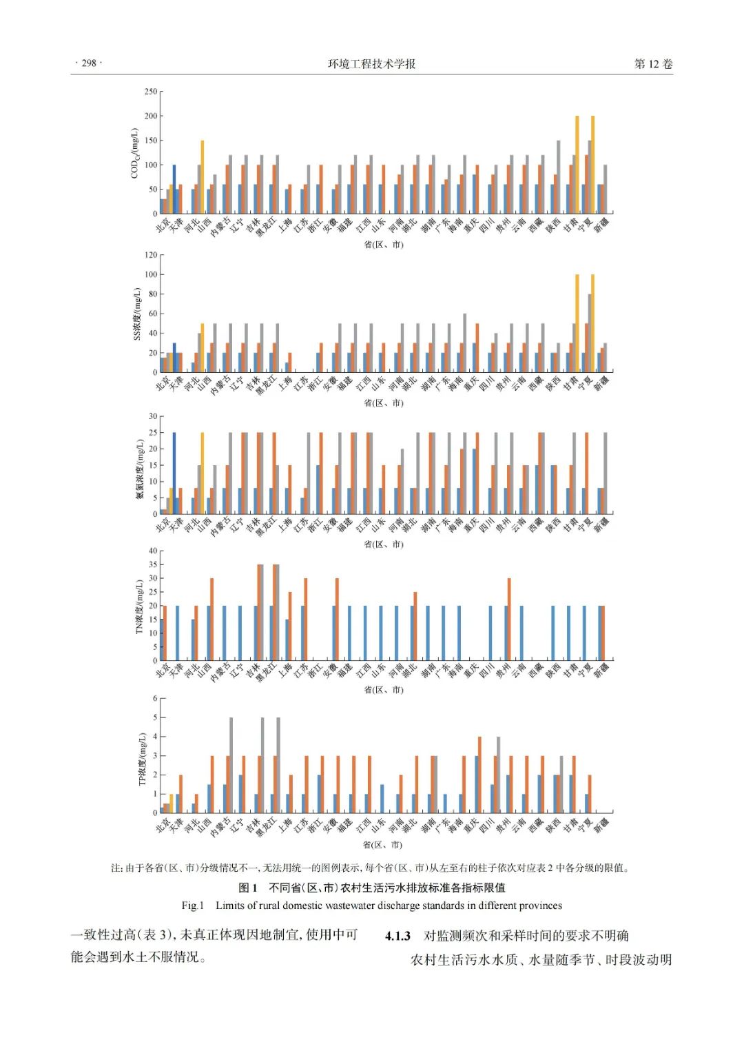 農村生活污水處理設施水污染排放標準關系到農村生活污水治理技術的選取、建設投資及運行維護,科學合理地制定排放標準具有重要意義。對我國 30 個省(區、市)已發布的農村生活污水處理設施水污染物排放地方標準的適用范圍、分級分類情況、污染物控制指標選取及限值、監測采樣方法等進行了對比分析,發現我國農村生活污水污染物排放地方標準存在適用范圍及分級分類不科學、指標限值區域化不明顯、監測及采樣方法不明確等問題。針對上述問題提出根據功能分區及處理規模科學制定分級分類標準,因地制宜地選取污染物控制指標,指標限值應做到寬嚴相濟,進一步明確監測頻次及采樣方法,強化標準的基準研究等相關建議,以期為完善農村生活污水處理標準體系提供指導與借鑒。