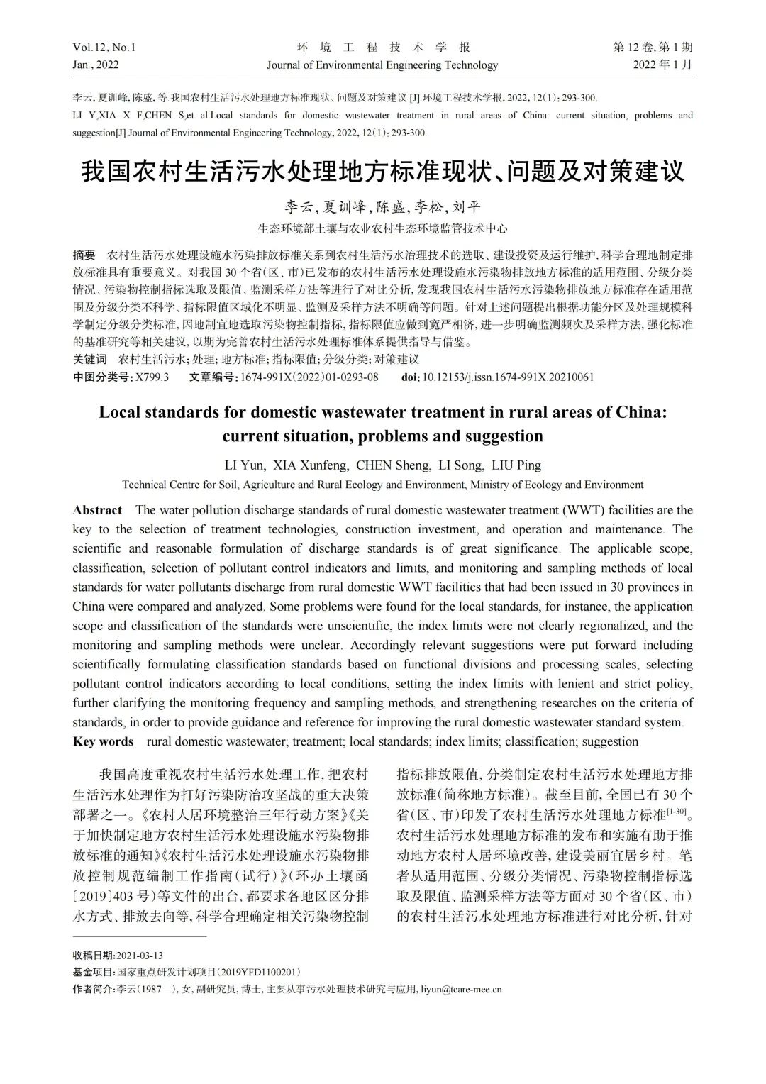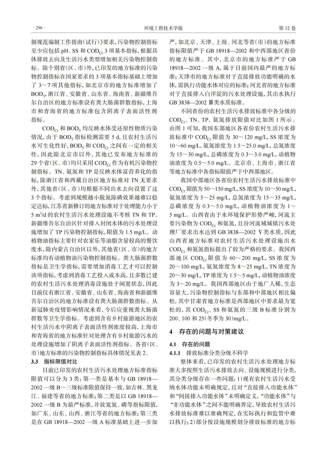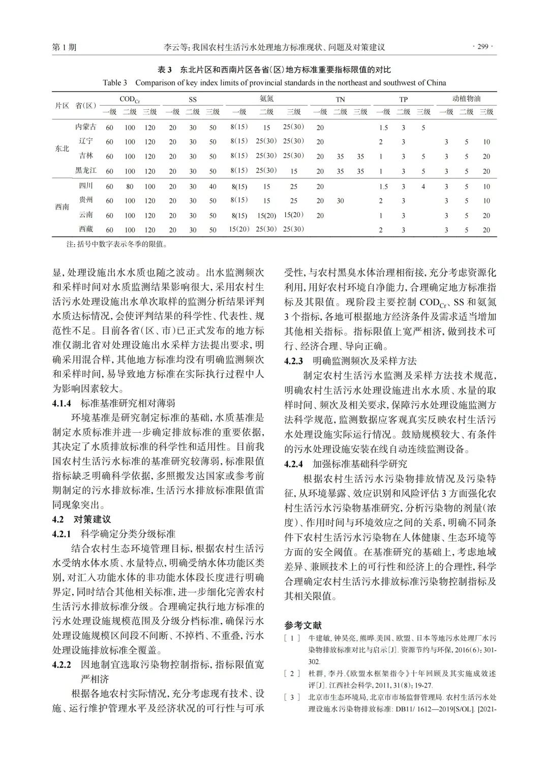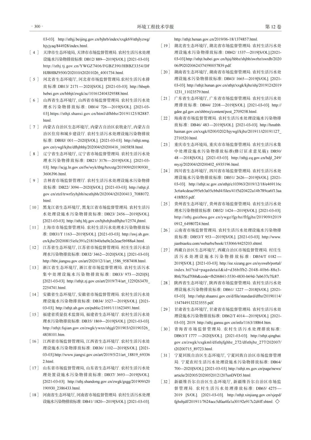 農村生活污水處理設施水污染排放標準關系到農村生活污水治理技術的選取、建設投資及運行維護,科學合理地制定排放標準具有重要意義。對我國 30 個省(區、市)已發布的農村生活污水處理設施水污染物排放地方標準的適用范圍、分級分類情況、污染物控制指標選取及限值、監測采樣方法等進行了對比分析,發現我國農村生活污水污染物排放地方標準存在適用范圍及分級分類不科學、指標限值區域化不明顯、監測及采樣方法不明確等問題。針對上述問題提出根據功能分區及處理規模科學制定分級分類標準,因地制宜地選取污染物控制指標,指標限值應做到寬嚴相濟,進一步明確監測頻次及采樣方法,強化標準的基準研究等相關建議,以期為完善農村生活污水處理標準體系提供指導與借鑒。