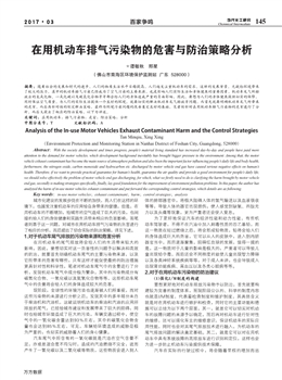 百家爭鳴 Chenmical Intermediate 145 2017·03 當代化工研究 在用機動車排氣污染物的危害與防治策略分析 *譚敏秋 邢星 (佛山市南海區環境保護監測站 廣東 528000) 摘要:隨著社會的發展和時代的進步,人們的物質生活水平日趨提高,人們越發注重機動車的需求,這樣的發展背景,無疑給環境帶來 了較大的壓力,其中的機動車排氣污染已經成為了空氣污染的主要來源,也是影響人們實際生活和身體健康的重要因素,機動車尾氣所排 放出的氮氧化物、一氧化碳以及碳氫化合物等等都會給人們的身體造成嚴重的負面影響,因此,要想為人們的身體健康提供切實的保障, 同時保證空氣質量,為人們的實際生活提供一個良好的環境,就要切實的解決機動車尾氣排放等問題,而首先就要明確機動車尾氣所帶來 的危害,而后再針對性的制定解決策略,最終為環境污染問題的改善奠定良好的基礎,筆者則針對在用機動車排氣污染物的危害進行了分 析,而后又提出了相應的防治策略,以下為詳述。 關鍵詞:在用機動車;排氣污染物;危害;防治策略;分析 中圖分類號:T 文獻標識碼:A Analysis of the In-use Motor Vehicles Exhaust Contaminant Harm and the Control Strategies Tan Minqiu, Xing Xing (Environment Protection and Monitoring Station in Nanhai District of Foshan City, Guangdong, 528000) Abstract:With the society development and times progress, people’s material living standard has increased day-by-day and people have paid more attention to the demand for motor vehicles, which development background inevitably has brought bigger pressure to the environment. Among that, the motor vehicle exhaust contaminant has become the main source of atmosphere pollution and also been the important factor influencing people’s daily life and body health, furthermore, the nitrogen oxide, carbon monoxide and hydrocarbon etc. discharged by motor vehicle end gas have caused serious negative effects on human’s health. Therefore, if we want to provide practical guarantee for human’s health, guarantee the air quality and provide a good environment for people’s daily life, we should solve effectively the problem of motor vehicle end gas discharging, for which, what we firstly need to do is clarifying the harm brought by motor vehicle end gas, secondly is making strategies specifically, finally, lay good foundation for the improvement of environment pollution problems. In this paper, the author has analyzed the harm of in-use motor vehicles exhaust contaminant and put forward the corresponding control strategies, which details are as following. Key words:in-use motor vehicles;exhaust contaminant;harm;control strategies;analysis 城市化建設的發展步伐在不斷的加快,而人們在這樣的環 境下,也越發注重機動車的應用給自身帶來的便捷,但是,在 用機動車的不斷增加,給城市的空氣造成了巨大的污染,也間 接的給人們的身體健康和實踐生活帶來相應的負面影響,而筆 者則基于這一問題,對城市在用機動車排氣污染物的危害進行 了相應的分析,而后提出了切合實際的防治策略,詳見下述。 1.對于機動車尾氣排放的污染物來源和危害分析 在用機動車的尾氣排放將會給人們的生活帶來較大的 影響,因此,要想切實對這一危害性的問題予以解決和高效 的防治,就要首先明確機動車尾氣的主要污染物來源,以及 它所帶來的危害有哪些,只有這樣才能促使最終的防治措施 更具針對性和科學性,筆者對機動車尾氣中的含量進行了分 析,發現機動車尾氣中成分極為繁雜,其中的污染物成分有 碳氫化合物、一氧化碳以及氮氧化合物等等,這些機動車尾 氣中的含量將會給人們的身體造成較大的危害。 現階段,全球性的環境污染也逐漸被人們所重視,而對 這些污染物的來源進行分析之后,發現其中的多半部分來自 于柴油機和汽油機,這就說明機動車的柴油和汽油的應用所 排放的尾氣,已經給城市建設和發展帶來了較大的阻礙,同 時也給城市環境造成了巨大的污染,車輛交通過程中,使空 氣中的一氧化碳含量達到93%左右,其中的碳氫化合物含 量也會達到85%左右,可見,車輛給環境造成的威脅是極 為嚴重的,也切實的威脅著人們的身心健康。 汽車尾氣中所含有的一氧化碳就是汽油在空氣含量不 足,亦或是混合度不均勻時,造成的汽油燃燒不完全,進而 產生了一氧化碳以及二氧化碳等物質,這些物質會進入到人 體的肺部器官中,將極大阻礙人體的氧氣輸送以及血液吸收 等等,導致人體的器官出現損傷,使人感覺到缺氧、四肢無 力以及頭痛等現象,更為嚴重者還會使人窒息。 為了更好地保證汽車的經濟性能和動力性能,有些機 動車駕駛者,不得不在汽油中加入劇毒性質的四乙基鉛,而 這一物質在經過燃燒之后,將會形成鉛物質,鉛將會給人們 的身體造成巨大的危害,它可以從人的皮膚中,進入到內臟 器官當中,而后逐漸聚集,阻礙紅血球的發展,值得一提的 是,這一物質對于兒童的影響是極大的,嚴重者可以導致兒 童出現鉛中毒,而后還會不同程度的致使兒童出現智力障礙 以及各類神經系統疾病等等,對于成人來講,也會導致成人 出現腎功能疾病、高血壓以及各類心臟病等等。 2.對于在用機動車污染物的防治建議 (1)強化I/M制度的構建 要想更好地對機動車排放污染物予以防治,首先就要構 建較為完善的制度體系,而現階段公認的、科學的制度內容 也就是I/M制度,代表著檢查制度和維護制度,其具體含義 就是對在用機動車進行維護和檢查,同時它的主要功能和措 施可以總結為以下兩個層面,其