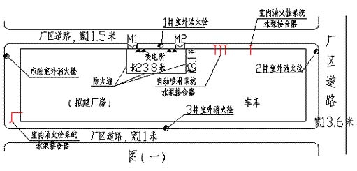 ????一層設有消防水池、消防水泵房;一層停車庫及各層生產車間均設置室內消火栓與自動噴水滅火系統,并分別設置專用消防水泵臨時加壓供水,其設計符合相關消防設計要求;各層按規范要求配置一定數量的磷酸銨鹽干粉滅火器。一層變電所長23.80m,寬8.10m,建筑面積193m2,內設4具2kg裝磷酸銨鹽干粉滅火器。室外設4套室外消火栓。消防設施設置如圖(一)所示。