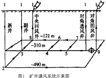 該礦當(dāng)時(shí)共有3個(gè)通風(fēng)水平:總回風(fēng)水平,標(biāo)高-121m;一水平(生產(chǎn)水平),標(biāo)高-310m;二水平(生產(chǎn)準(zhǔn)備水平),標(biāo)高-490m。共有3個(gè)進(jìn)風(fēng)井:副井和對角進(jìn)風(fēng)井,至一水平;新進(jìn)(綜合提升井),至二水平。共有2個(gè)回風(fēng)井:中央邊界回風(fēng)井,至總回風(fēng)水平;對角回風(fēng)井,至一水平。通風(fēng)方式為中央邊界與中央對角混合抽出式,屬于多風(fēng)井多水平通風(fēng)礦井,其通風(fēng)系統(tǒng)如圖1所示。