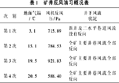 該礦進(jìn)行的這4次反風(fēng)演習(xí),均采用中央主要通風(fēng)機(jī)單臺反風(fēng)的反風(fēng)方式(停對角風(fēng)機(jī)),反風(fēng)方法都是利用風(fēng)機(jī)反風(fēng)道進(jìn)行反風(fēng)。4次反風(fēng)演習(xí)時(shí)的地面大氣溫度、風(fēng)機(jī)的反風(fēng)壓力,以及反風(fēng)時(shí)井下主要井巷的風(fēng)流狀況如表1所示。