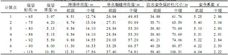 對(duì)于緩傾斜煤層,開采以后垮落帶的邊界位于采空區(qū)邊界范圍以內(nèi),導(dǎo)水裂縫帶的邊界位于采空區(qū)邊界范圍以外。 垮落帶和導(dǎo)水裂縫帶均呈馬鞍形,導(dǎo)水裂縫帶的最高點(diǎn)位于采空區(qū)傾斜方向的上部。本采區(qū)開采后上覆巖層的破壞空間形態(tài)符合一般規(guī)律。根據(jù)水庫附近鉆孔柱狀圖,基巖頂部標(biāo)高約為 + 188 m,而導(dǎo)水裂縫帶發(fā)育的最大標(biāo)高與基巖頂部邊界之間的基巖巖柱厚度均在 200 m 以上,再加上約 55 m 厚的第四系砂質(zhì)黏土的隔水作用,導(dǎo)水裂縫帶是不會(huì)波及地表上的水體 ——宋溝水庫,即導(dǎo)水裂縫帶不會(huì)形成礦井水災(zāi)的通道。26 擴(kuò)大區(qū)開采范圍及開采上限已經(jīng)確定,為了驗(yàn)證開采上限的可行性及合理性,進(jìn)一步分析防水安全煤巖柱及其安全系數(shù),在防水安全煤巖柱計(jì)算過程中,對(duì)覆巖按 “中硬” 和 “軟弱” 兩種類型進(jìn)行計(jì)算。各計(jì)算點(diǎn)防水安全煤巖柱尺寸及安全系數(shù)如表 3 所示。從表中結(jié)果可知,各計(jì)算點(diǎn)的安全系數(shù)最小為2.22,即各點(diǎn)的防水安全煤巖柱尺寸均遠(yuǎn)小于基巖巖柱尺寸,導(dǎo)水裂縫帶未波及水庫水體。所以 26 擴(kuò)大區(qū)各工作面在開采上限以下采煤從導(dǎo)水裂縫帶分析是安全的。