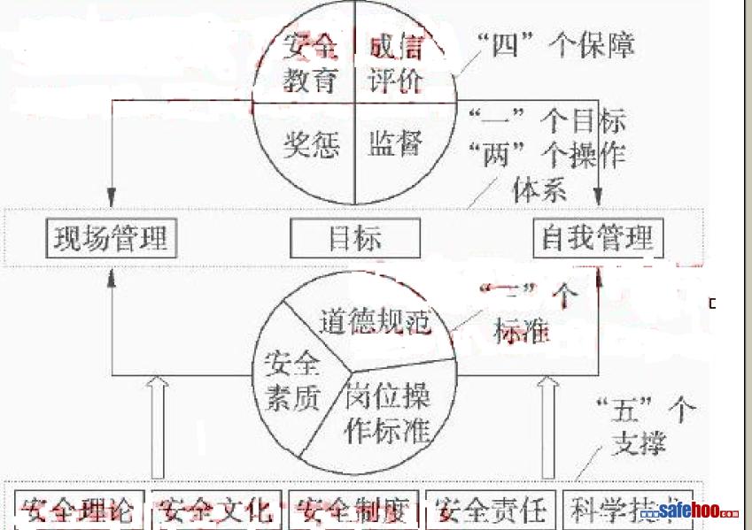 ??5建立員工安全誠信管理體系基于上面的安全誠信的模式,建立了安全誠信管理體系。安全誠信體系包括:“一”個目標、“兩”個操作體系、“三”個標準、“四”個保障、“五”個支撐?!耙弧眰€目標即打造本質安全型礦井?!皟伞眰€操作體系包括現(xiàn)場管理和自我管理?!叭眰€標準即道德標準、技能標準以及崗位操作標準?!八摹眰€保障是安全教育、安全誠信評價、安全投入和安全監(jiān)督?!拔濉眰€支撐包括安全文化、安全理論、安全制度、安全責任以及信息系統(tǒng)。各要素之間的關系如下圖所示: