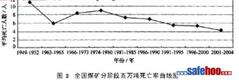 ?2 百萬噸死亡率的變化趨勢安全生產最主要的指標就是百萬噸死亡率。權威數據示,近幾年我國的煤礦安全生產形勢呈現穩定好轉的趨(見圖2),但與其他一些產煤大國相比仍存在很大的差。調查顯示,我國煤礦平均每人每年產煤321t,全員效率僅為美國的2 2%,南非的8 1%,而百萬噸死亡率則是美國的100倍,南非的30倍。據專家估計,我國每年因各類煤礦傷亡事故和職業病造成的直接和間接經濟損失達250多億元,建國以來,其累積損失超過4000多億元,給國家造成了巨大的經濟損失。?