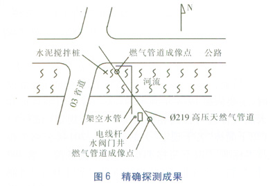 通過地震映像法、磁梯度法及孔中雷達法等綜合探測方法,探明了河底小口徑天然氣管道的精確位置(見圖6),探測誤差小于0.15cm。橋梁拓寬工程得以順利實施,也確保了天然氣管道的安全。