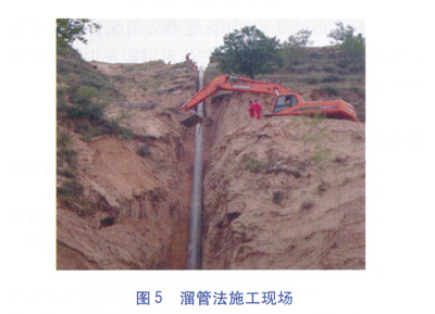 如果山體(沖溝)地形比較復雜,吊管機等大型設備及管材無法到達坡頂,只能采取拖管法進行施工。管溝開挖方法與2.1節相同。