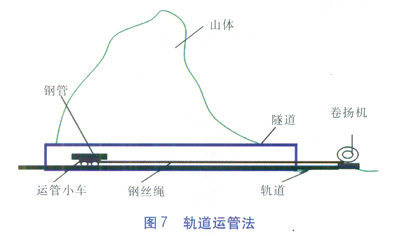 此方法(見圖7)主要指在隧道的一端設置卷揚機,卷揚機通過鋼絲繩牽引運管小車在隧道內敷設的軌道上行走,從而達到運送鋼管的目的。