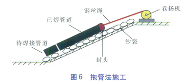 拖管法就是利用卷揚機[4]提供牽引動力,將管道從斜坡底部向上拖動并在斜坡下部組對焊接的施工方法(見圖6)。當管道沿縱坡翻越山體,山坡傾斜角為30°~50°,且大型設備及管材無法到達坡頂時,適用拖管法作業。首先將管道統一布放到坡底,在山頂設置一臺卷揚機,鋼絲繩連接管道一端封頭上的吊耳,通過鋼絲繩將坡體下的第一根管道向上拖動,第2根管道用設置在坡底的吊車(圖6中未畫出)吊裝至焊接位置,進行這2根管道的焊接。然后卷揚機將已經焊接成一體的2根管道向上拖動,用設置在坡底的吊車將第3根管道吊裝至焊接位置,進行組焊。依此類推,直至第一根管道到達坡頂完成連頭作業。在拖動鋼管時,斜坡管溝內要鋪墊一層沙袋以防止鋼管直接與沙石接觸破壞防腐層。此施工方法在山地施工中得到廣泛應用。