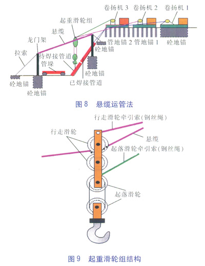 懸纜運管法[5]就是利用懸纜(鋼絲繩)做承重索,利用卷揚機牽引滑輪組在懸纜上移動,將滑輪組下方吊著的鋼管運送至管溝內,逐根進行組焊。