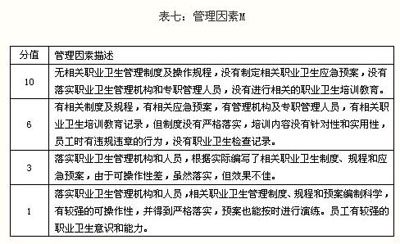 職業健康危害因素的危害風險大小與職業危害發生的可能性L、員工暴露時間E、危害后果嚴重性C相關,還與包括企業的管理控制水平及員工的安全意識和防范技能的管理因素M有關。
