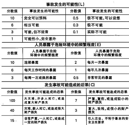 作業(yè)條件危險性評價用與系統(tǒng)風險有關的三種因素之積來評價系統(tǒng)人員傷亡風險大小的,這三種因素是:L(事故發(fā)生的可能性)、E(人員暴露于危險環(huán)境中的頻繁程度)和C(一旦發(fā)生事故可能造成的后果)。危險評價的依據(jù):