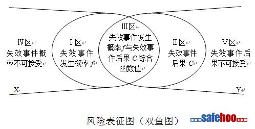 風險表征圖因為像兩條魚相交,稱之為雙魚圖,概率魚X與后果魚Y相交分成了五個區域,分別為Ⅰ區(失效事件f區)、Ⅱ區(失效事件后果C區)、Ⅲ區(失效事件f與失效事件后果C綜合函數值區)、Ⅳ區(失效事件概率不可接受區)、Ⅴ區(失效事件后果不可接受區)。