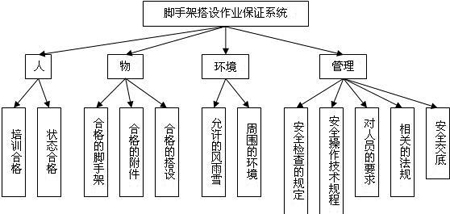 (3) 安全保證體系的建立。根據腳手架搭設作業(yè)的特點和事故原因分析的結果,從作業(yè)中人、設備、環(huán)境和管理四個方面考慮,運用故障樹分析法得到腳手架搭設作業(yè)保證系統(tǒng)圖,如圖3所示。