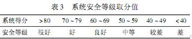 ??? 由公式(1)計(jì)算出系統(tǒng)的總得分后,再按照安全等級(jí)得出評(píng)價(jià)結(jié)論,從而完成安全檢查表的定量處理過(guò)程。系統(tǒng)安全等級(jí)取分值見(jiàn)表3: